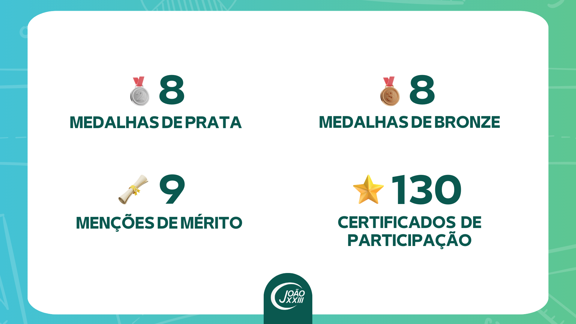 Ficamos imensamente orgulhosos com a participação expressiva de nossos estudantes e com as muitas conquistas alcançadas. Mais do que medalhas, celebramos o envolvimento, o crescimento pessoal e o entusiasmo pelo conhecimento.